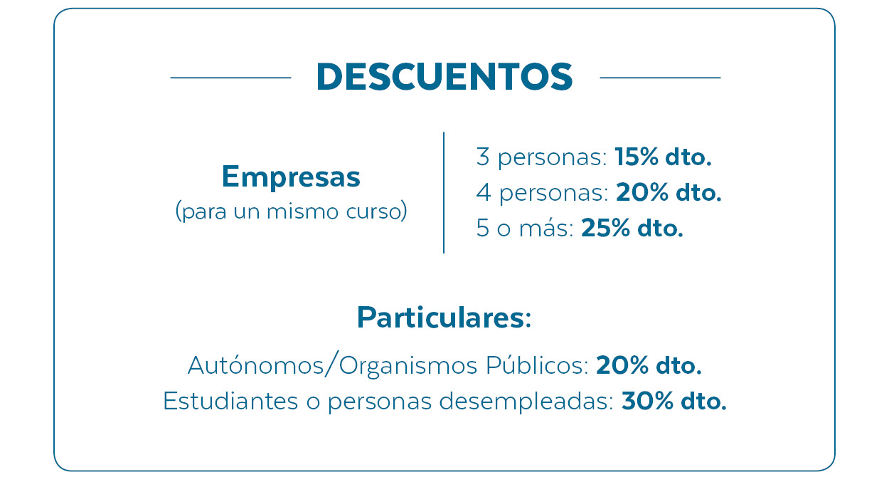 Si desea recibir este curso para un grupo amplio de personas, en sus instalaciones o en modalidad virtual, llámenos o contacte desde el formulario indicándonos todos los detalles (nº alumnos, objetivo que buscan...etc.) y en breve le daremos respuesta.